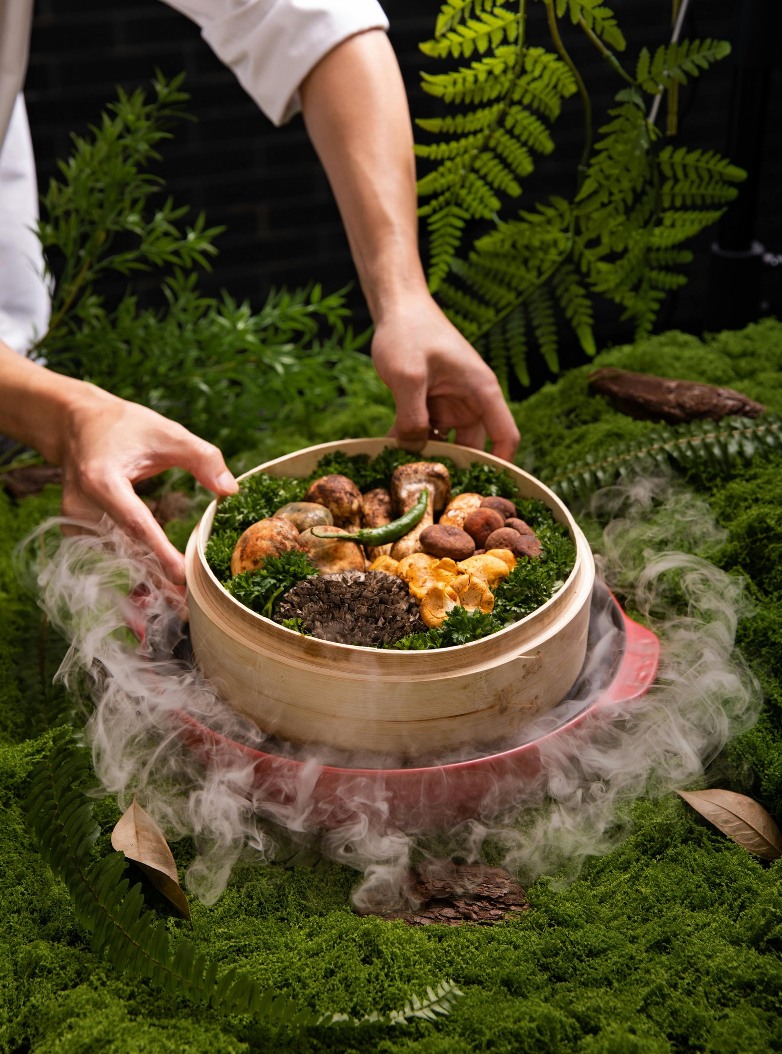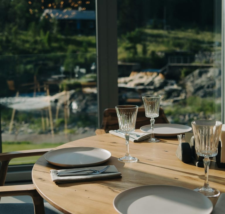 The restaurant’s design mirrors the landscape: natural textures, soft light, and gentle sounds of the forest outside.